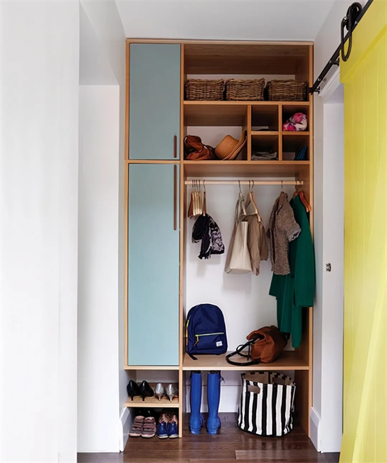 想给玄关装个柜子做衣物鞋子收纳,但是进门处空间也只有那么一点,而一般柜子的宽度都在600~800mm中间,装不好真的很占地。不妨试试这种嵌入式的玄关柜,没有储物柜堆积的现象,入墙也不占用外部走道空间,更适合小户型。